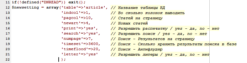 Поскольку модуль "Статьи" разрабатывался специально, с возможностью упрощенного "клонирования" данного модуля, настройки, относящиеся к данному модулю, были вынесены в отдельный файл.
