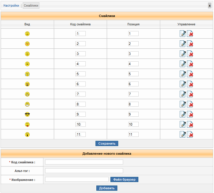 В этом разделе вы можете, добавить новые смайлики, а также заменить/отредактировать уже имеющиеся в системе.