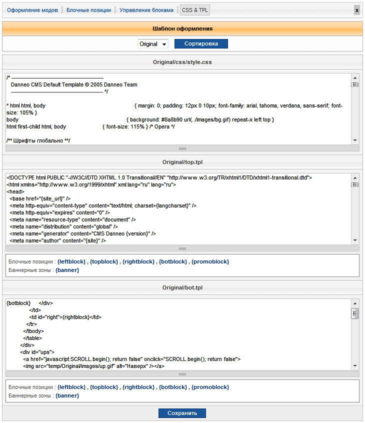 css-файлов стилей. На странице раздела "CSS & TPL" можно выбрать один и имеющихся в системе шаблонов (в выпадающем списке "Сортировка"), внести изменения и сохранить.