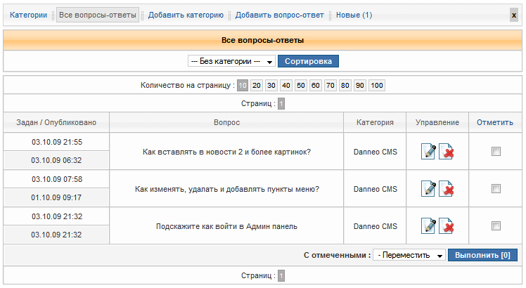 Имеется, сортировка вывода вопросов по категориям, постраничный вывод определенного количества вопросов, с возможностью установки количества выводимых на одной странице вопросов от 10 до 100.