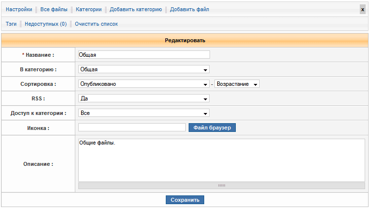 На странице в табличном виде отображены все имеющиеся категории файлов.