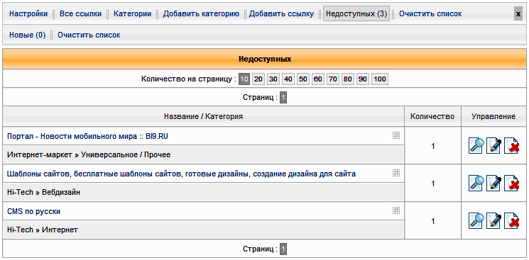 Ссылки представлены одним списком, с постраничной разбивкой, с возможностью установки количества выводимых на одной странице ссылок от 10 до 100.