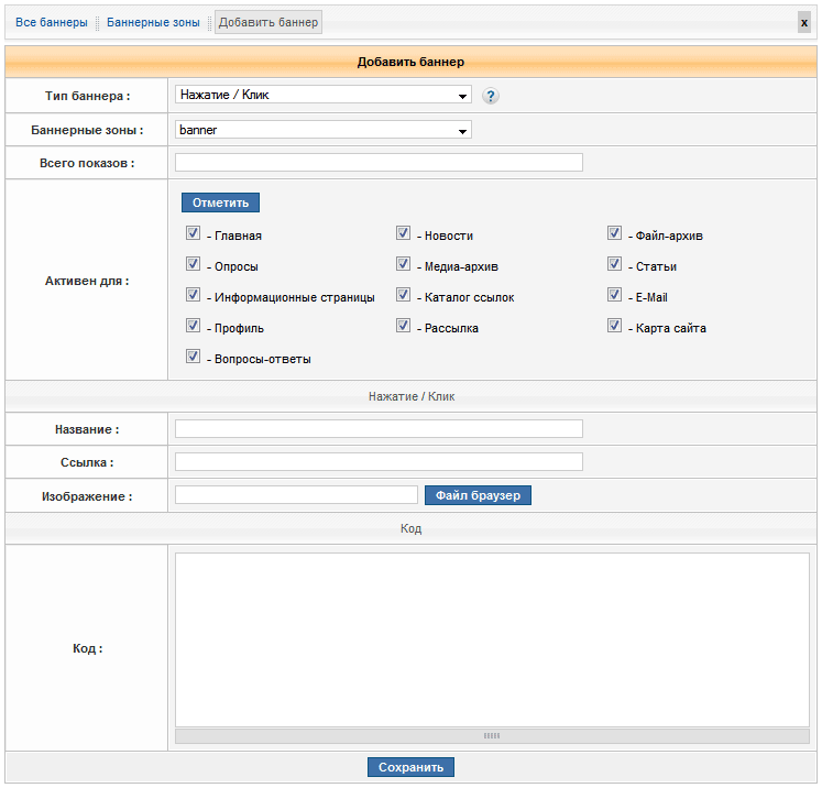 При выборе типа баннера "Нажатие / Клик", поле "Код" необходимо оставить пустым!