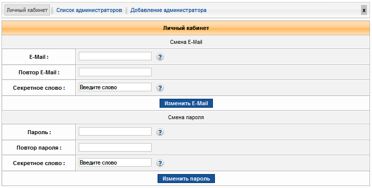 На этой странице действующий, главный администратор может сменить свой e-mail и пароль.