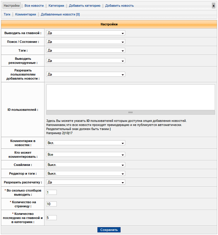 В данном поле можно указать ID (идентификатор) пользователей которым доступна опция добавления новостей.