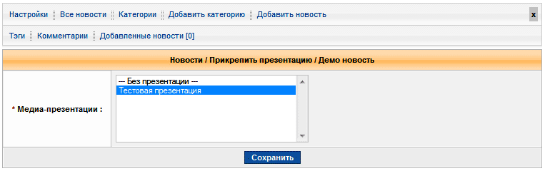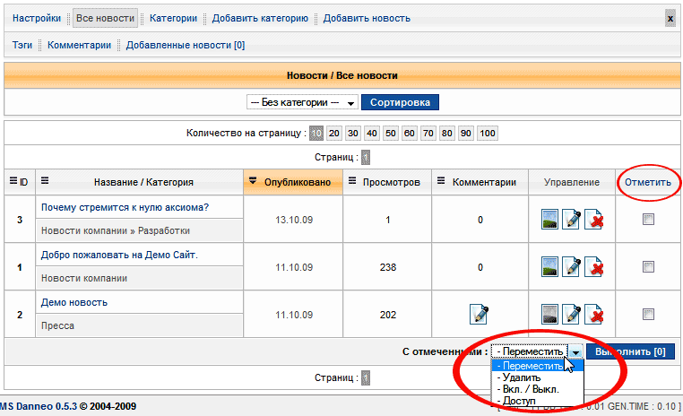 - Переместить - переместить одну или несколько новостей, в другую категорию.