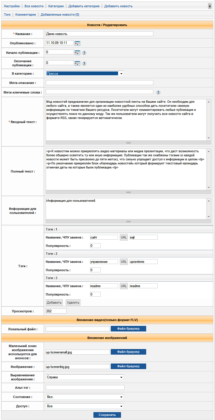 - Доступ - изменить доступ к одной или нескольким новостям.