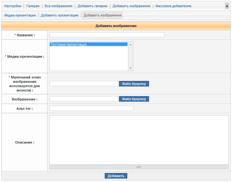 Для того чтобы добавить изображение в медиа-презентацию, нажмите кнопку управления "Добавить изображение".