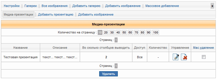Масс. удаление В последней колонке, можно (вручную) отметить одну или несколько медиа-презентаций, для удаления.
