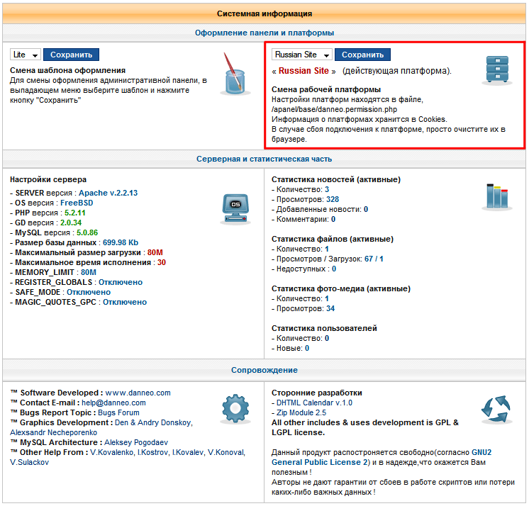 - Блок управления платформами сайтов, находится на главной странице административной панели, вверху справа.