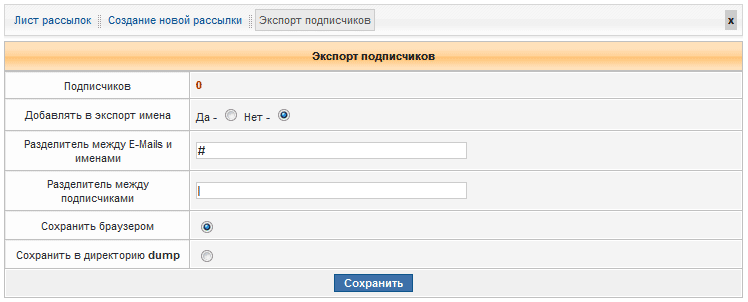 Сохранение списка может производиться в двух вариантах, посредством браузера на локальный компьютер, либо в директорию /apanel/dump/ на сервер.