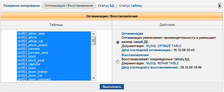 Рекомендуем производить оптимизацию базы, не реже одного раза в неделю! Оптимизация уменьшает размер базы данных, и положительно сказывается на скорости работы сайта!