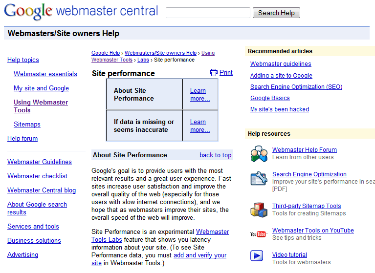Google Site Performance — предельно простой инструмент, отслеживающий скорость загрузки отдельных страниц сайта. После анализа полученных данных в панели веб-мастера от Google в одноименном разделе появляется временной график скорости загрузки страниц. Ниже размещаются примеры отдельных страниц с сайта веб-мастера и предложения по их оптимизации при помощи сервиса «Page Speed«. Этот сервис представляет собой дополнение к Firefox с открытым кодом, и может использоваться для оценки производительности веб-страниц, равно как и для получения предложений по их улучшению. По словам разработчиков, веб-мастера, запускающие Page Speed, получают набор оценок для каждой страницы, а также полезные предложения по улучшению ее производительности. Google Site Performance создана в свете недавних заявлений о том, что Google теперь при прочих равных условиях будет лучше ранжировать те сайты, которые быстрее загружаются.