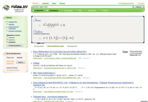 В российский поисковик Nigma добавили возможность решать системы рациональных неравенств, и находить область допустимых значений сложных функций, а также выполнять интегрирование и дифференцирование. Описание всего функционала в пресс-релизе