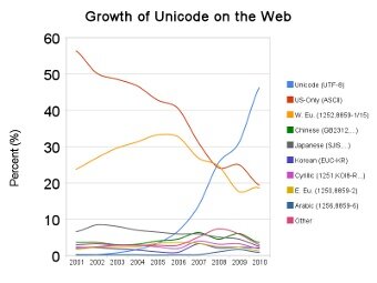 Unicode впервые обогнал все другие кодировки в мае 2008 года. Тогда его доля составляла около 25 процентов, как и доли ASCII- и западноевропейской кодировок. В 2001 году доля ASCII-кодировки составляла около 55 процентов. Сейчас она снизилась до 20.